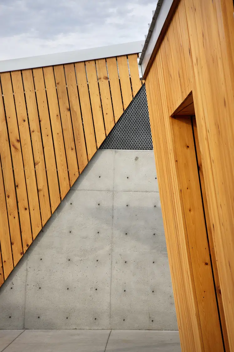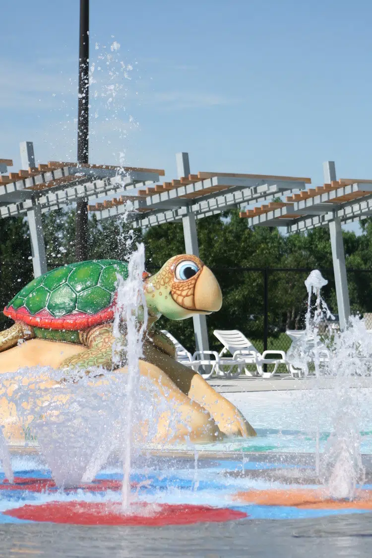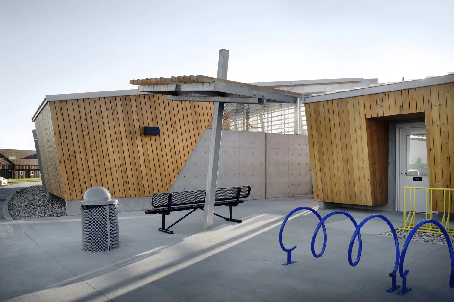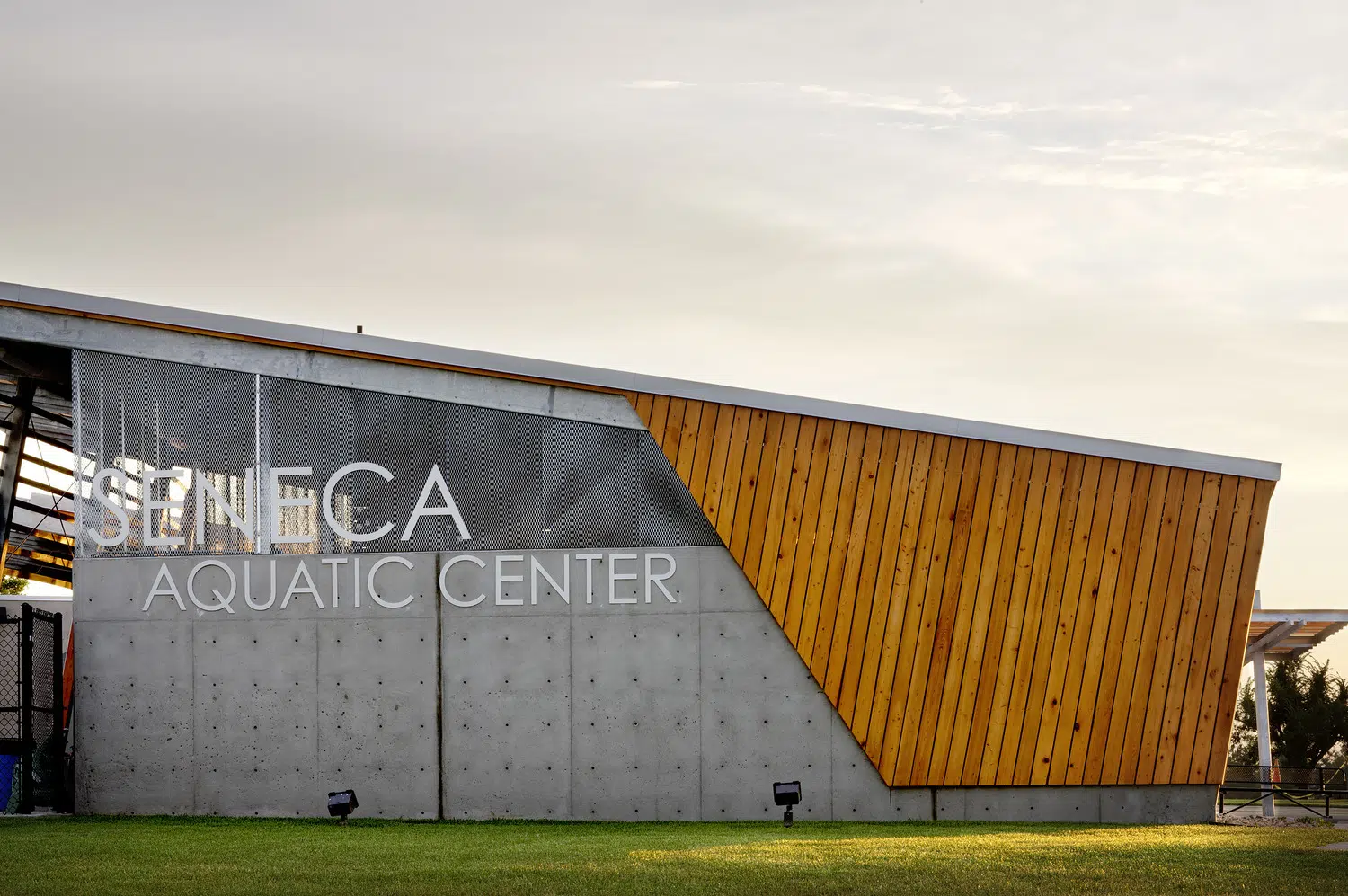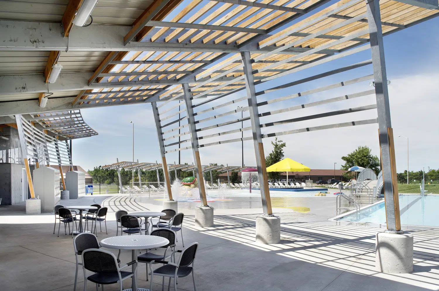 The outdoor aquatic center, includes a six-lane, 25-yard competition pool, diving well for 1 meter and 3 meter diving, water slides, a leisure pool with zero depth entry and water play features. A dedicated toddler area is incorporated into the zero depth leisure pool to allow safety for young swimmers but also allows connectivity to the remainder of aquatic areas. Other aquatic elements include shade structures, bermed grass decks, a floatable walk and a footbridge that spans the connection between the leisure pool and competition pool. Support buildings are articulated in three separate forms to reduce the scale of the structures and allow light and views between each.