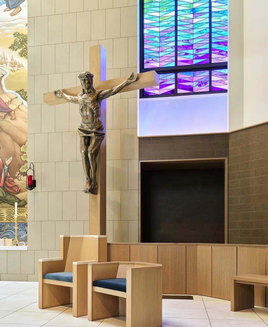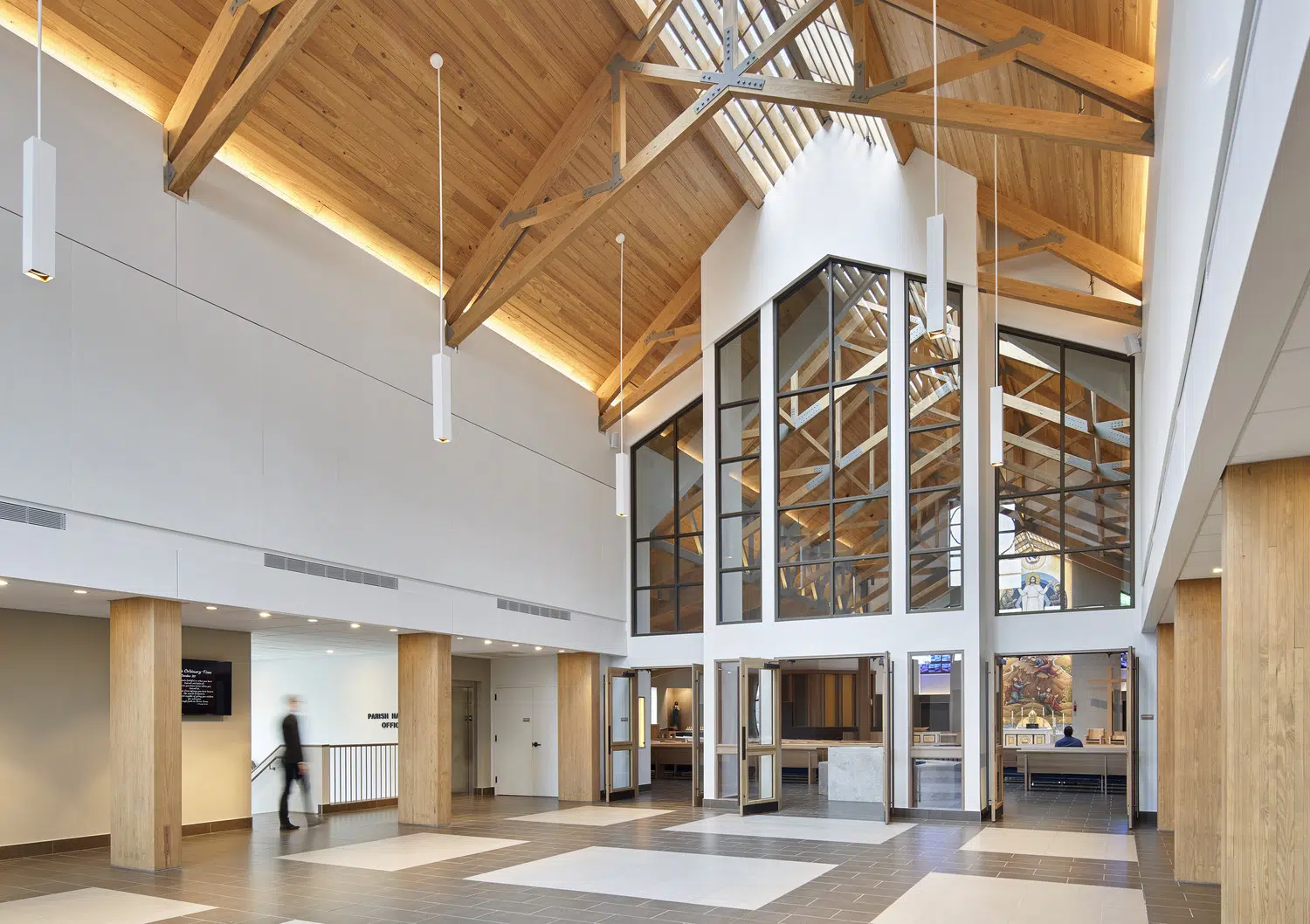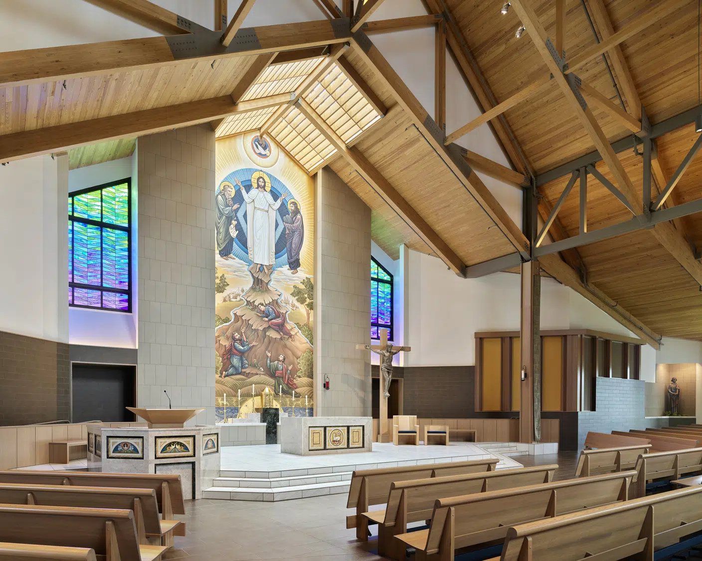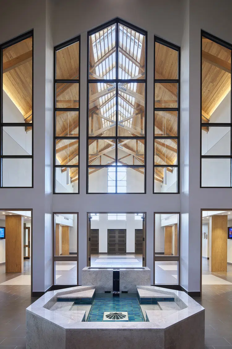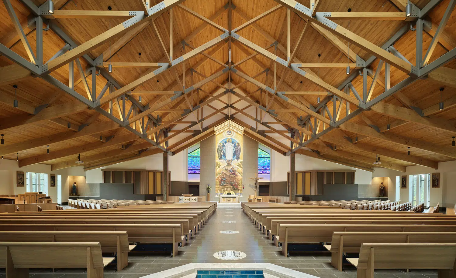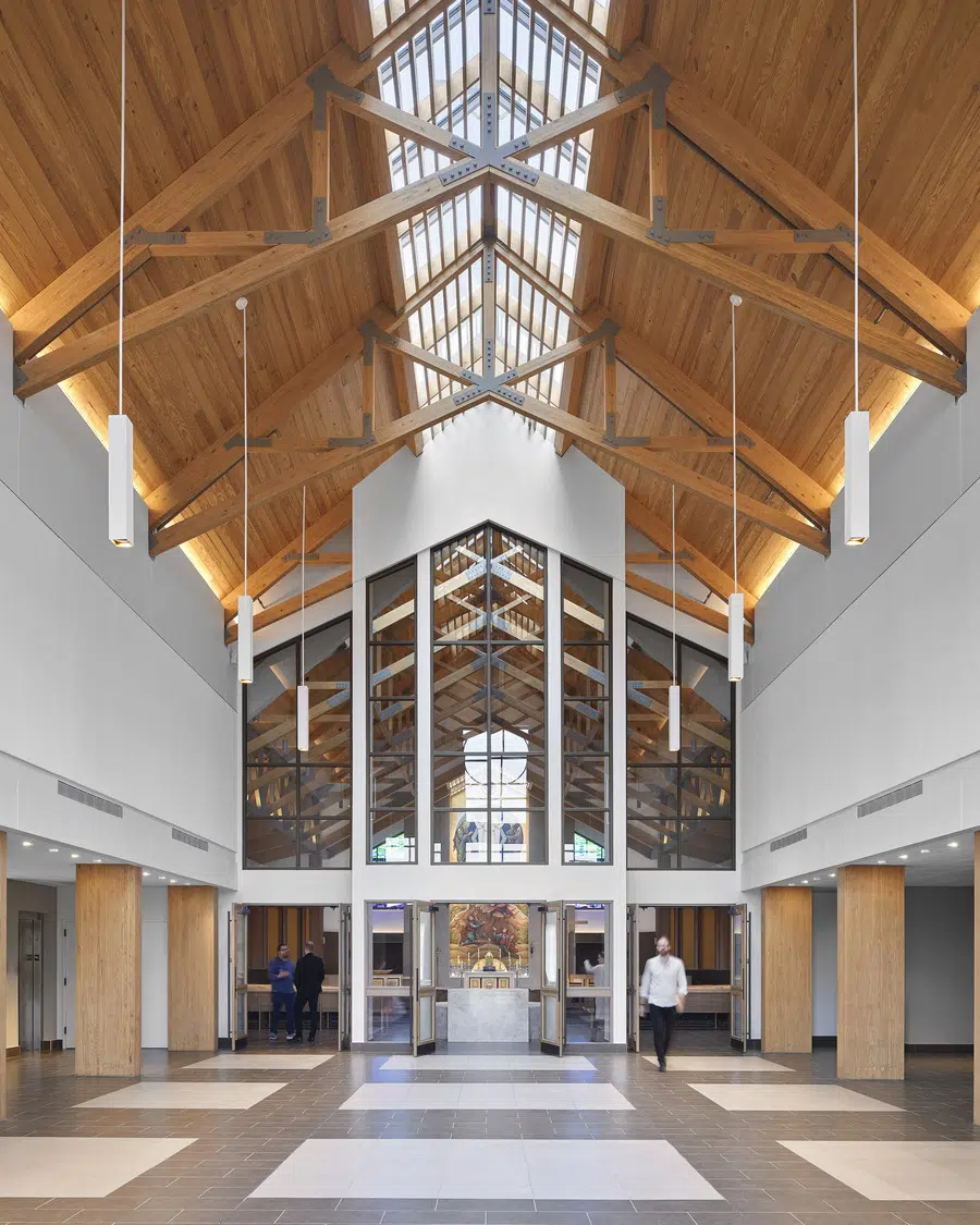 Phase 1 included the reconfiguration and expansion of the parking lot to address maintenance needs and accommodate future church construction. Phase 2 included design and construction of a new church building and adoration chapel, renovation of existing structures to accommodate school expansion, and new administrative offices. The new St. James Catholic Church rises from the highpoint of its site with its cross visible to the Liberty, Missouri community. The church’s interior, visible through the many windows and skylights, beckons as it glows warmly in the late hours of the evening. Inside, guests are bathed in filtered daylight from overhead skylights as they gather in the vaulted narthex. A small chapel to the side offers respite. Through the narthex’s double-height interior glazing lies the nave, an expansive, 1,200-person worship space topped by a delicate lattice of glulam trusses and solid wood decking. Fourteen-foot-tall stained-glass windows glow blue and green in the easterly morning sun and a 34-foot-tall hand-painted mural of the Transfiguration of Christ presides over the sanctuary. A parish hall below the narthex provides a large gathering space with kitchen in addition to meeting and classroom spaces.