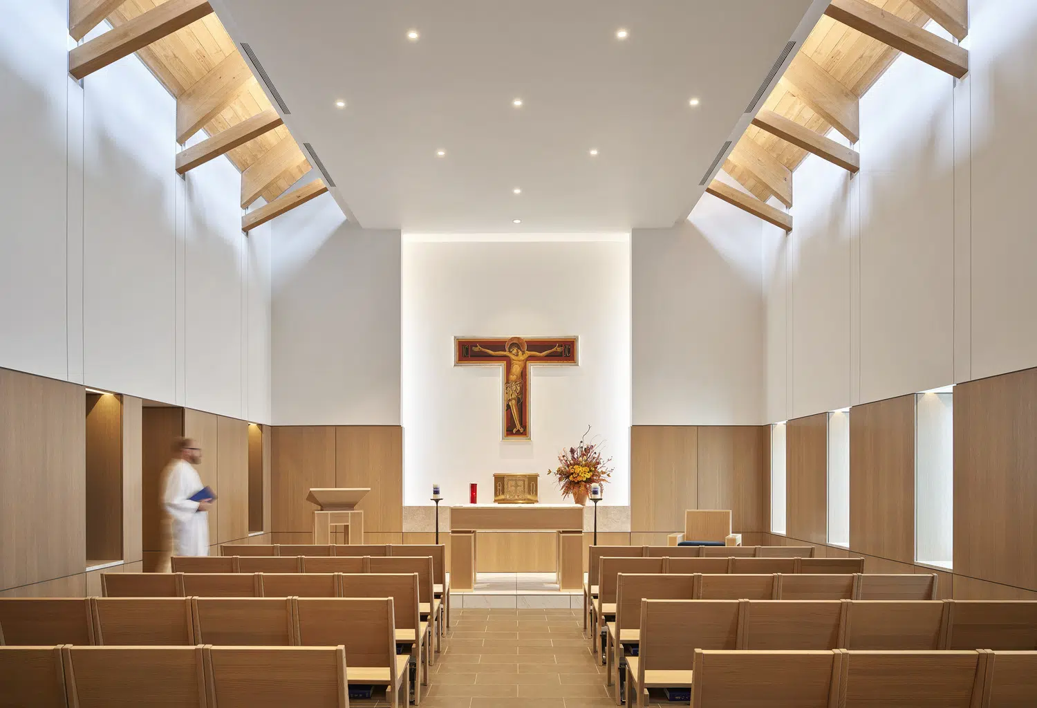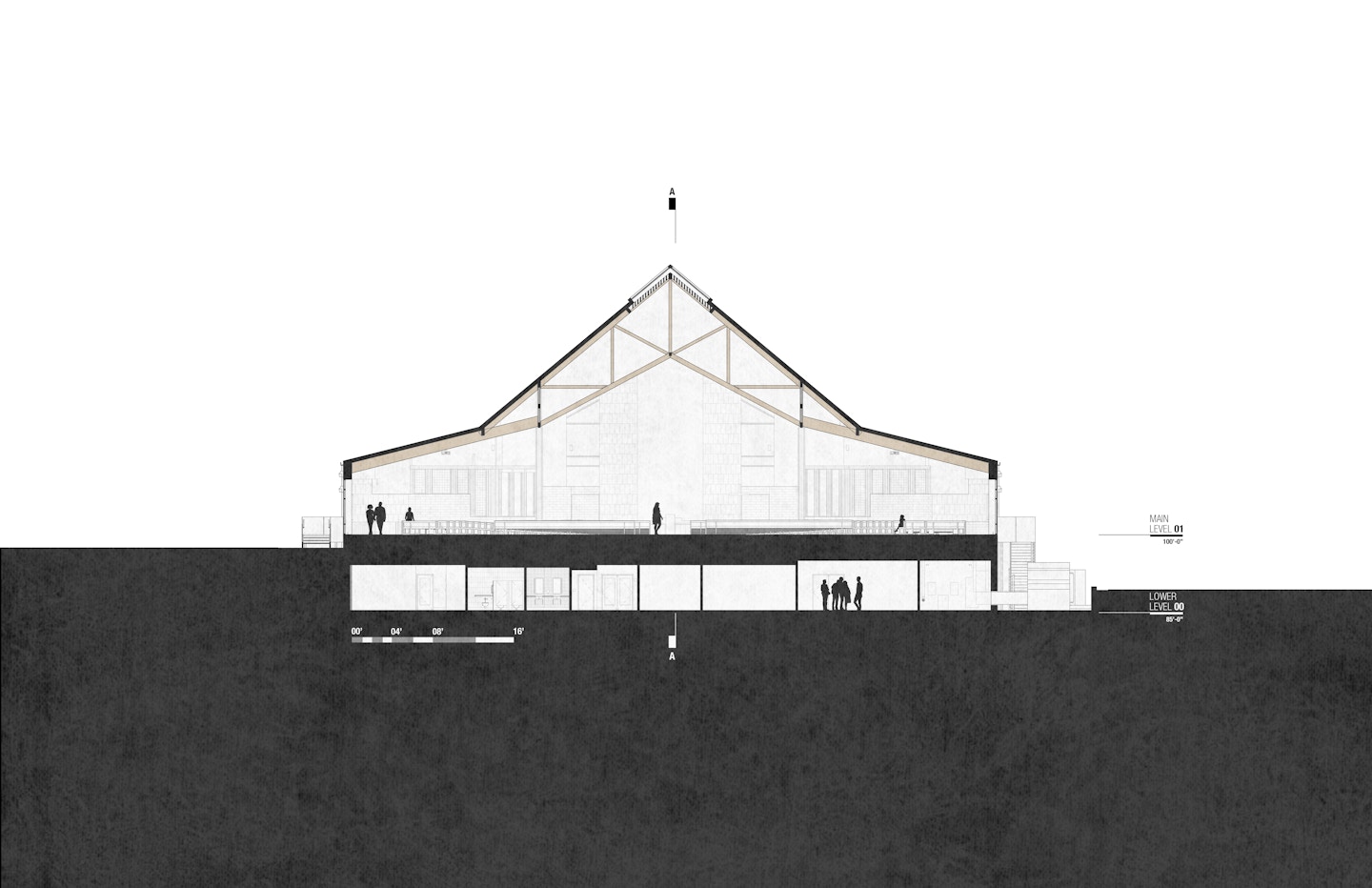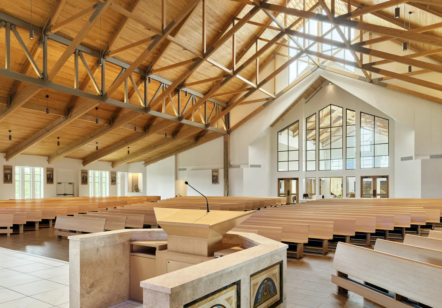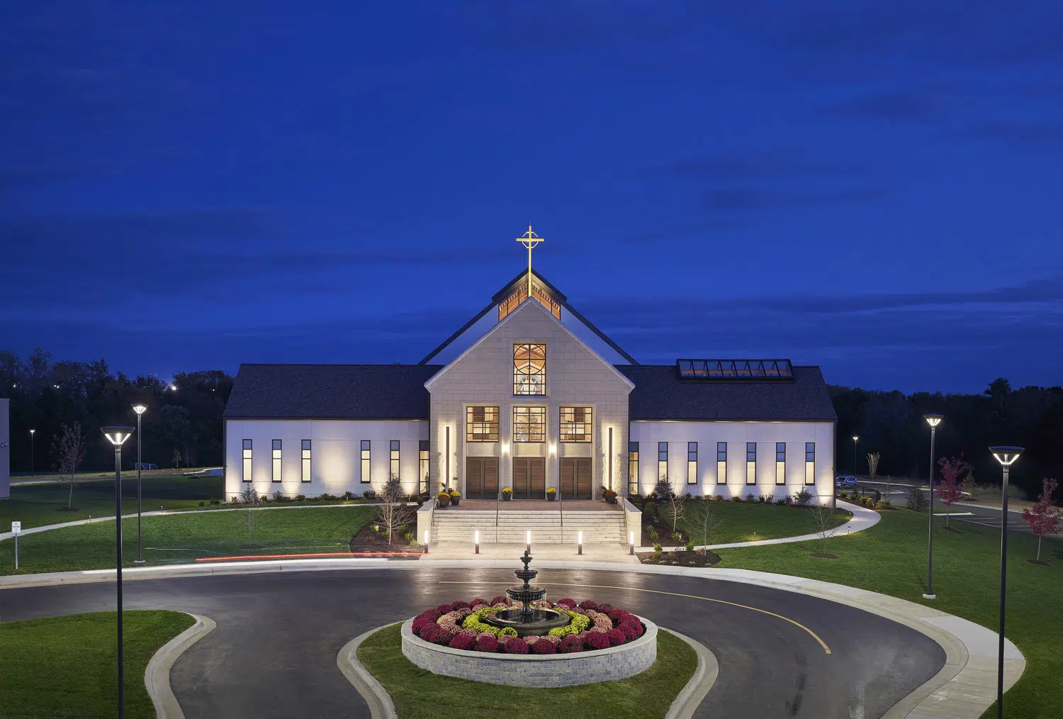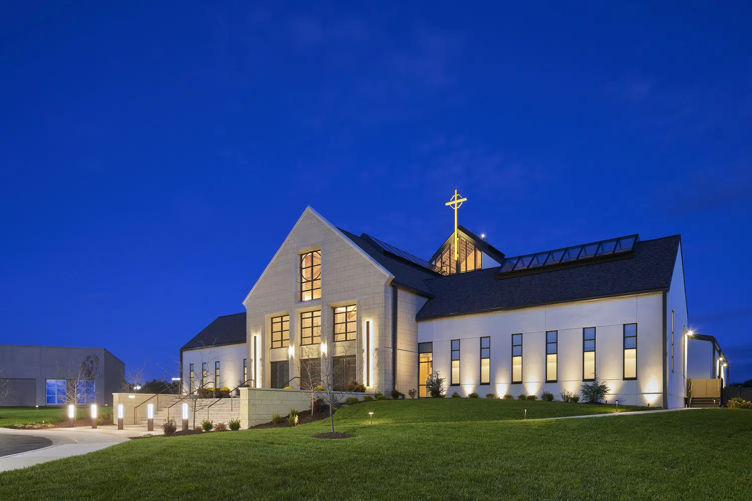 Phase 1 included the reconfiguration and expansion of the parking lot to address maintenance needs and accommodate future church construction. Phase 2 included design and construction of a new church building and adoration chapel, renovation of existing structures to accommodate school expansion, and new administrative offices. The new St. James Catholic Church rises from the highpoint of its site with its cross visible to the Liberty, Missouri community. The church’s interior, visible through the many windows and skylights, beckons as it glows warmly in the late hours of the evening. Inside, guests are bathed in filtered daylight from overhead skylights as they gather in the vaulted narthex. A small chapel to the side offers respite. Through the narthex’s double-height interior glazing lies the nave, an expansive, 1,200-person worship space topped by a delicate lattice of glulam trusses and solid wood decking. Fourteen-foot-tall stained-glass windows glow blue and green in the easterly morning sun and a 34-foot-tall hand-painted mural of the Transfiguration of Christ presides over the sanctuary. A parish hall below the narthex provides a large gathering space with kitchen in addition to meeting and classroom spaces.