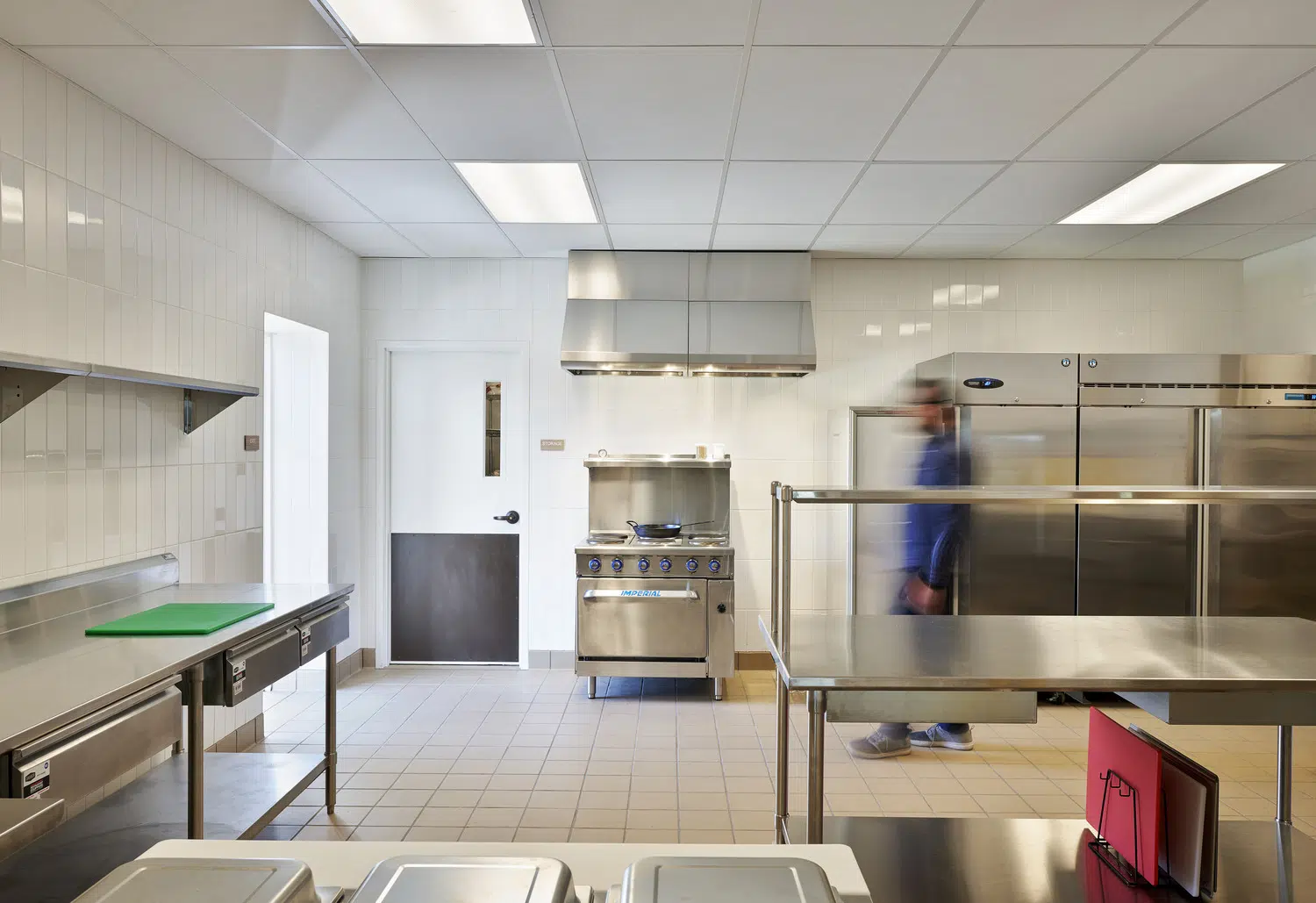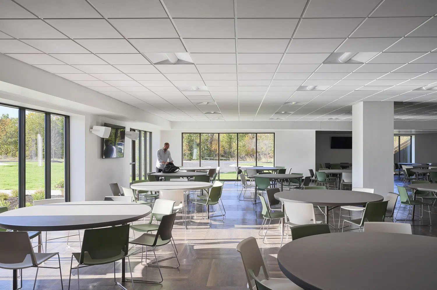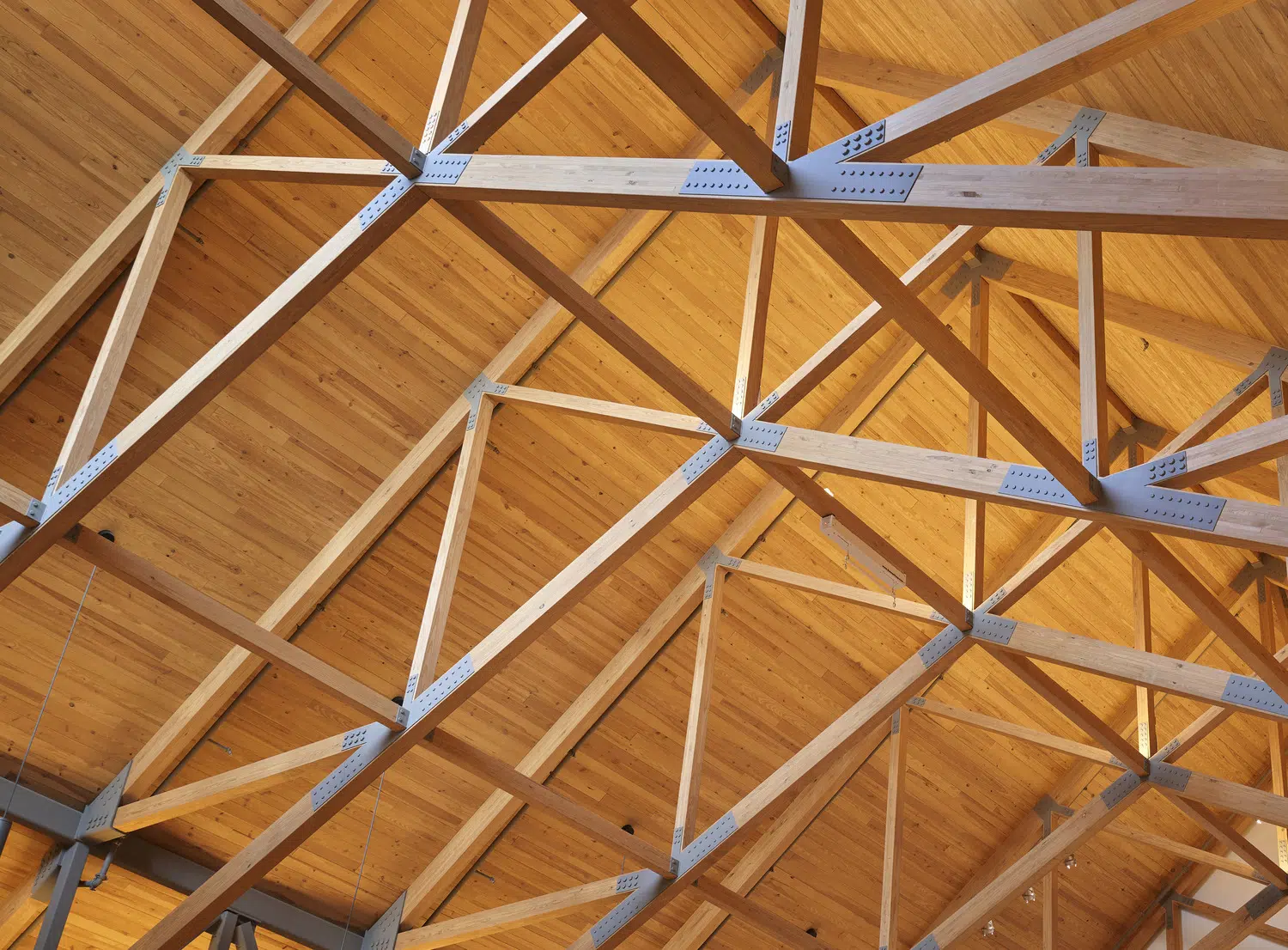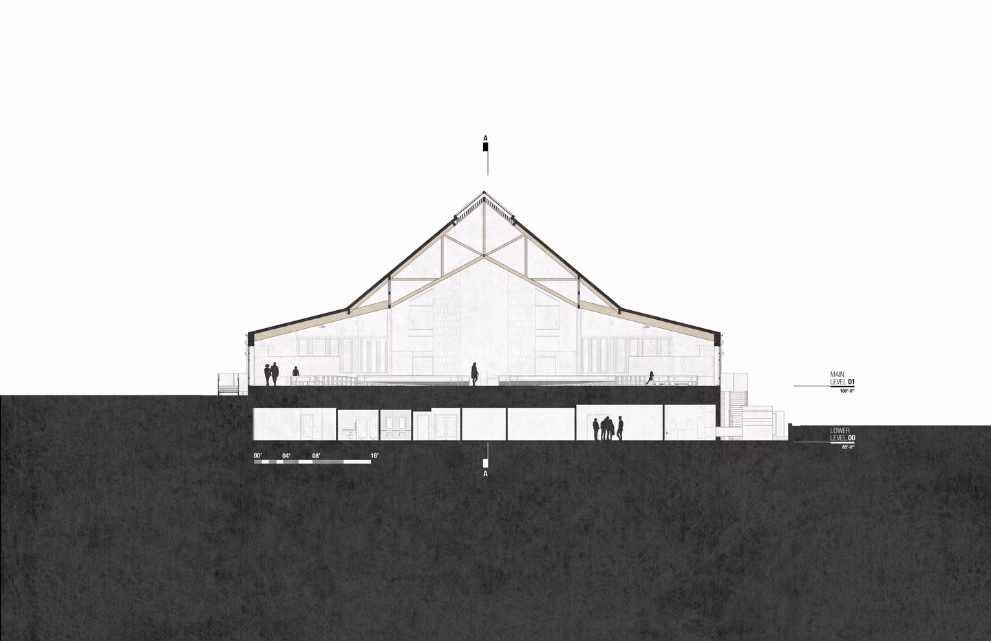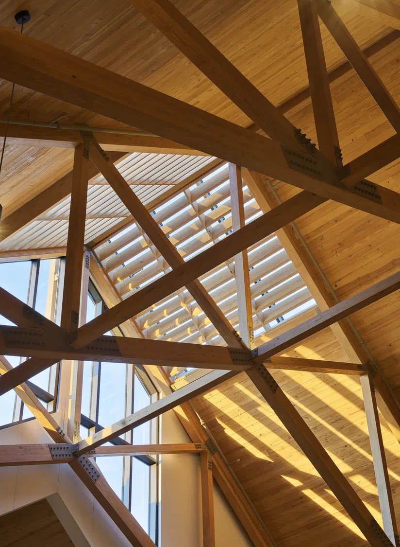 Phase 1 included the reconfiguration and expansion of the parking lot to address maintenance needs and accommodate future church construction. Phase 2 included design and construction of a new church building and adoration chapel, renovation of existing structures to accommodate school expansion, and new administrative offices. The new St. James Catholic Church rises from the highpoint of its site with its cross visible to the Liberty, Missouri community. The church’s interior, visible through the many windows and skylights, beckons as it glows warmly in the late hours of the evening. Inside, guests are bathed in filtered daylight from overhead skylights as they gather in the vaulted narthex. A small chapel to the side offers respite. Through the narthex’s double-height interior glazing lies the nave, an expansive, 1,200-person worship space topped by a delicate lattice of glulam trusses and solid wood decking. Fourteen-foot-tall stained-glass windows glow blue and green in the easterly morning sun and a 34-foot-tall hand-painted mural of the Transfiguration of Christ presides over the sanctuary. A parish hall below the narthex provides a large gathering space with kitchen in addition to meeting and classroom spaces.