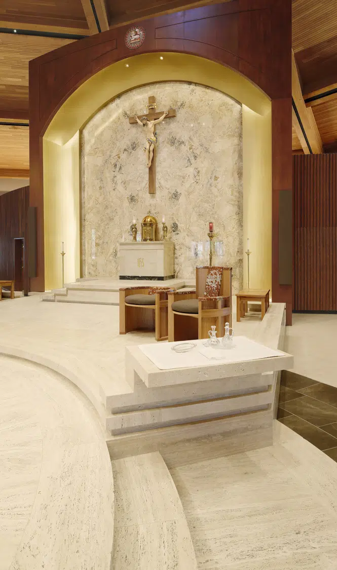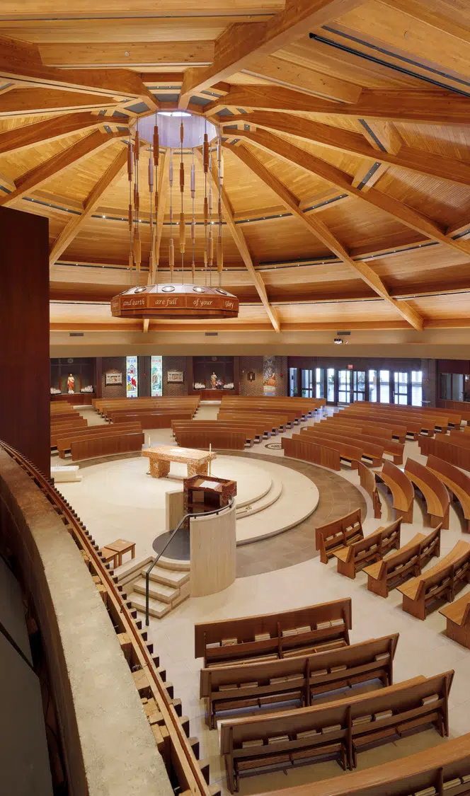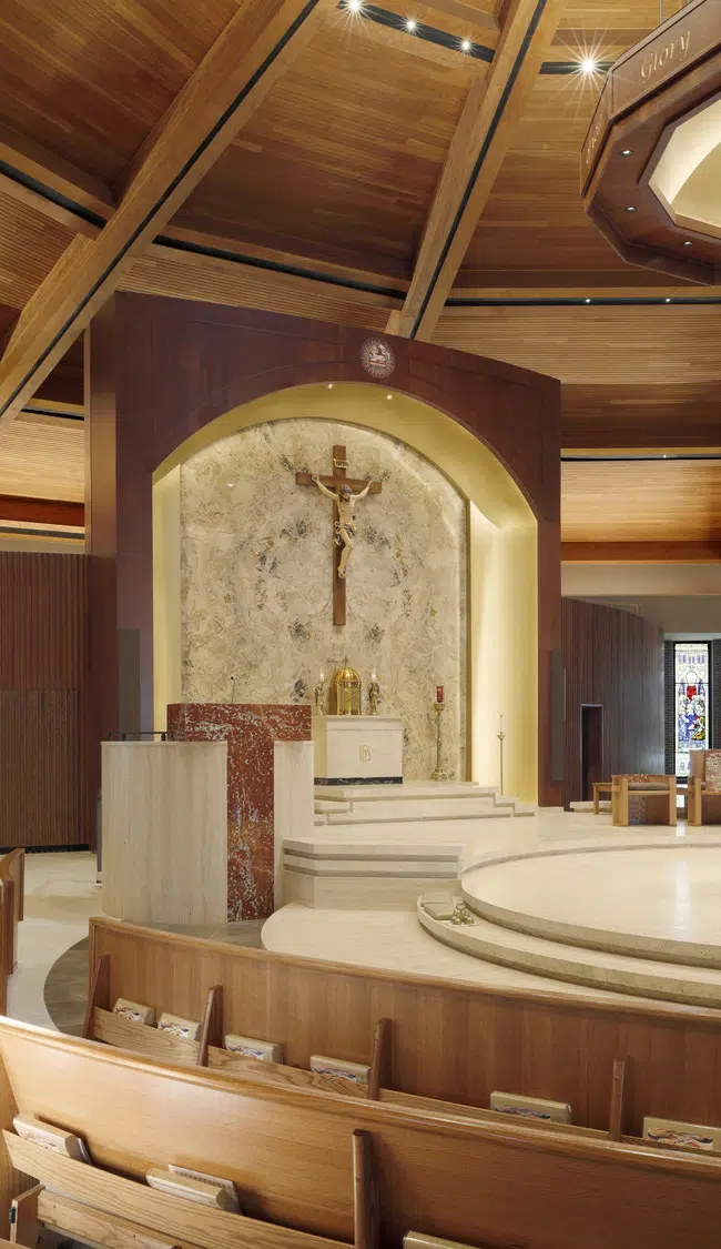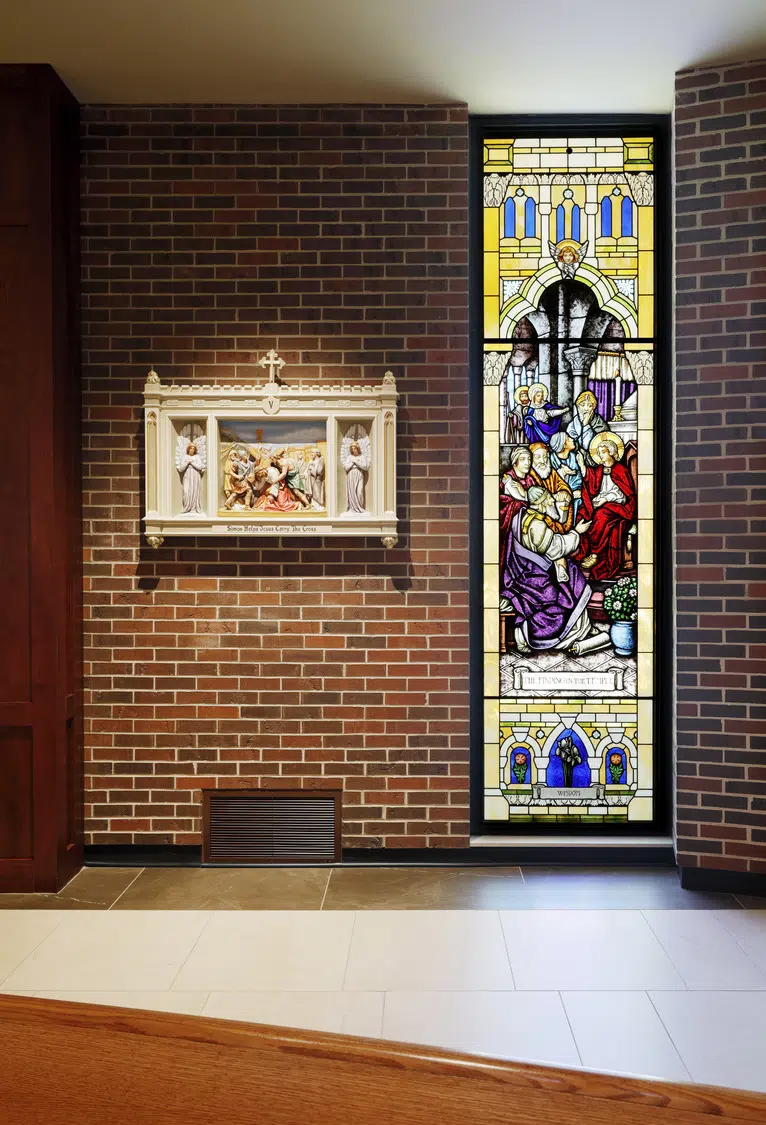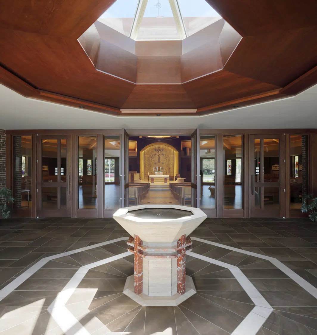 Within the sanctuary, new stained-glass windows, lighting, flooring, doors and pews enhance the existing worship space. A new ambo and an updated skylight above the altar create a focal point in the sanctuary. The choir occupies a new area in the sanctuary, with a new audio system and instruments to improve acoustics.