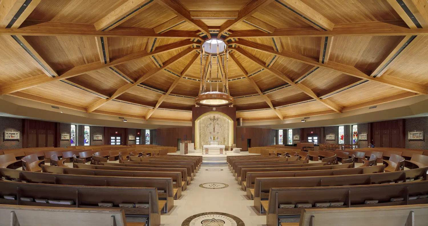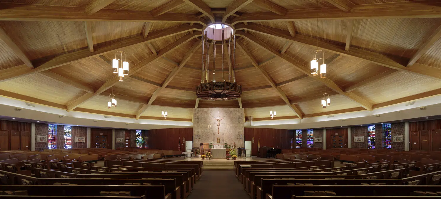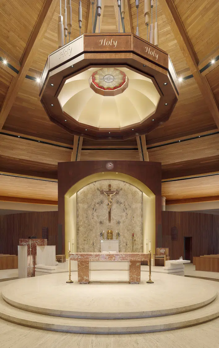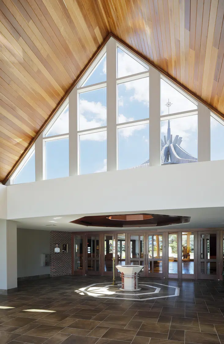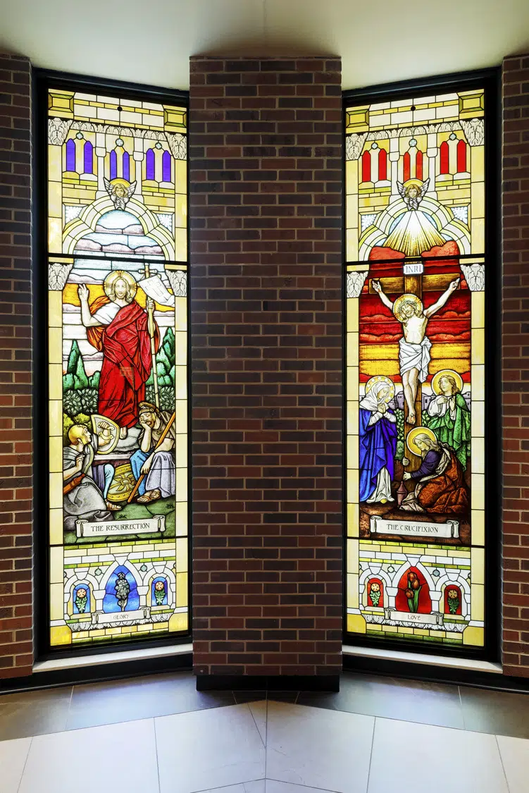 Within the sanctuary, new stained-glass windows, lighting, flooring, doors and pews enhance the existing worship space. A new ambo and an updated skylight above the altar create a focal point in the sanctuary. The choir occupies a new area in the sanctuary, with a new audio system and instruments to improve acoustics.