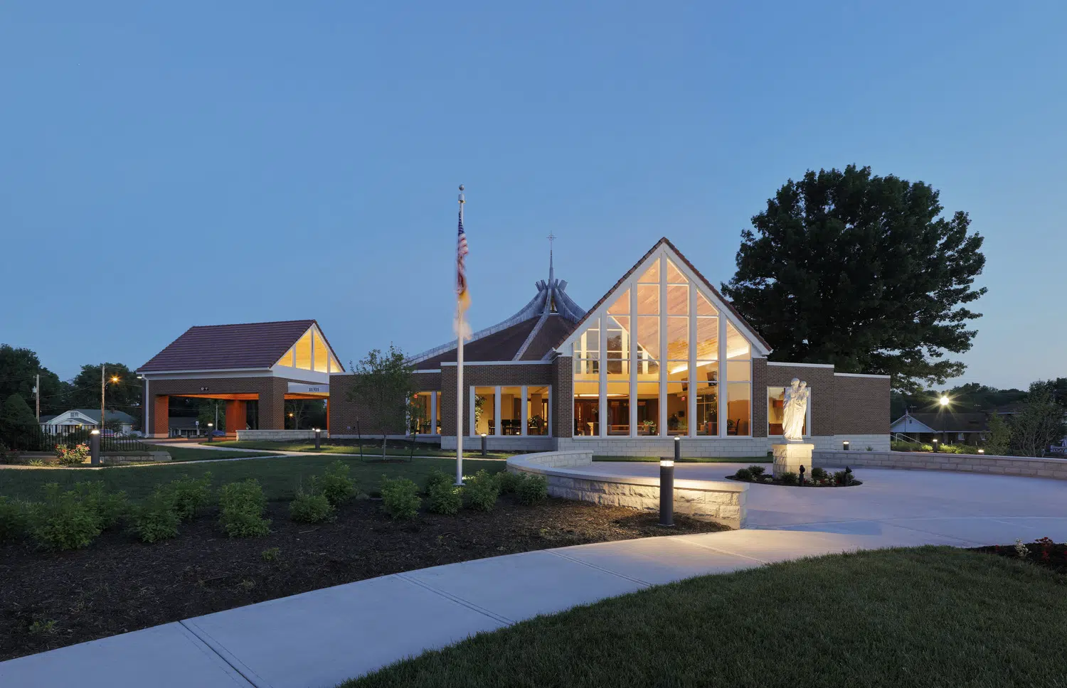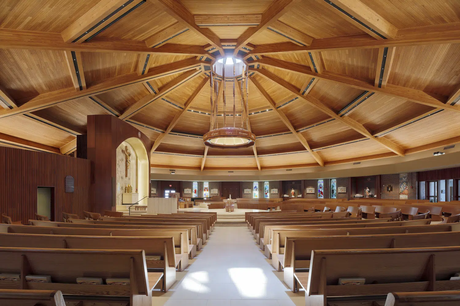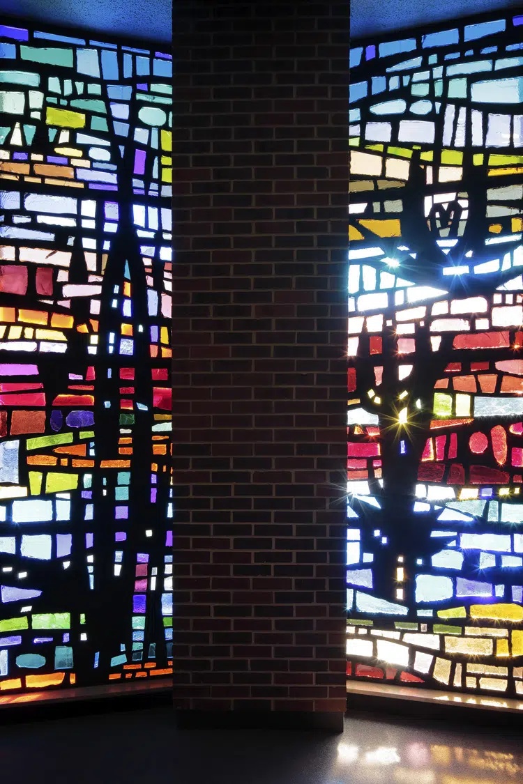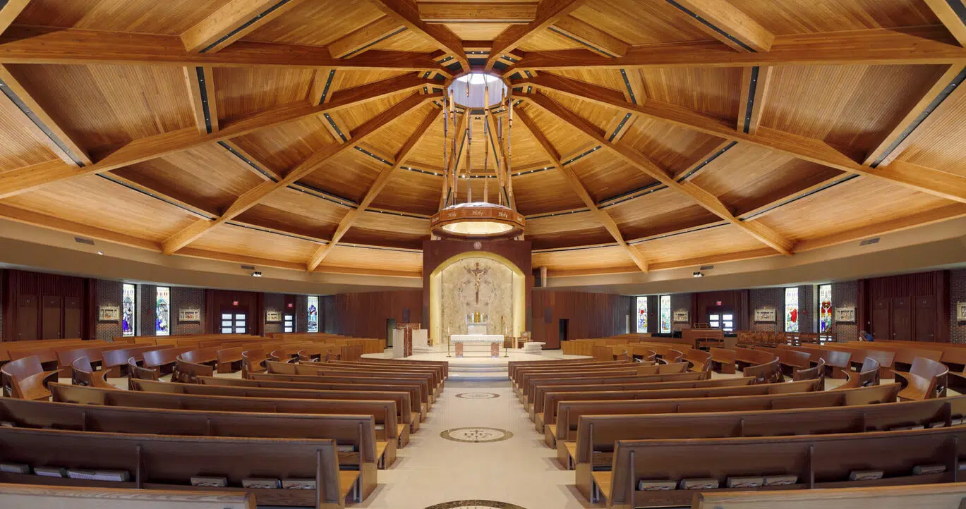 Within the sanctuary, new stained-glass windows, lighting, flooring, doors and pews enhance the existing worship space. A new ambo and an updated skylight above the altar create a focal point in the sanctuary. The choir occupies a new area in the sanctuary, with a new audio system and instruments to improve acoustics.
