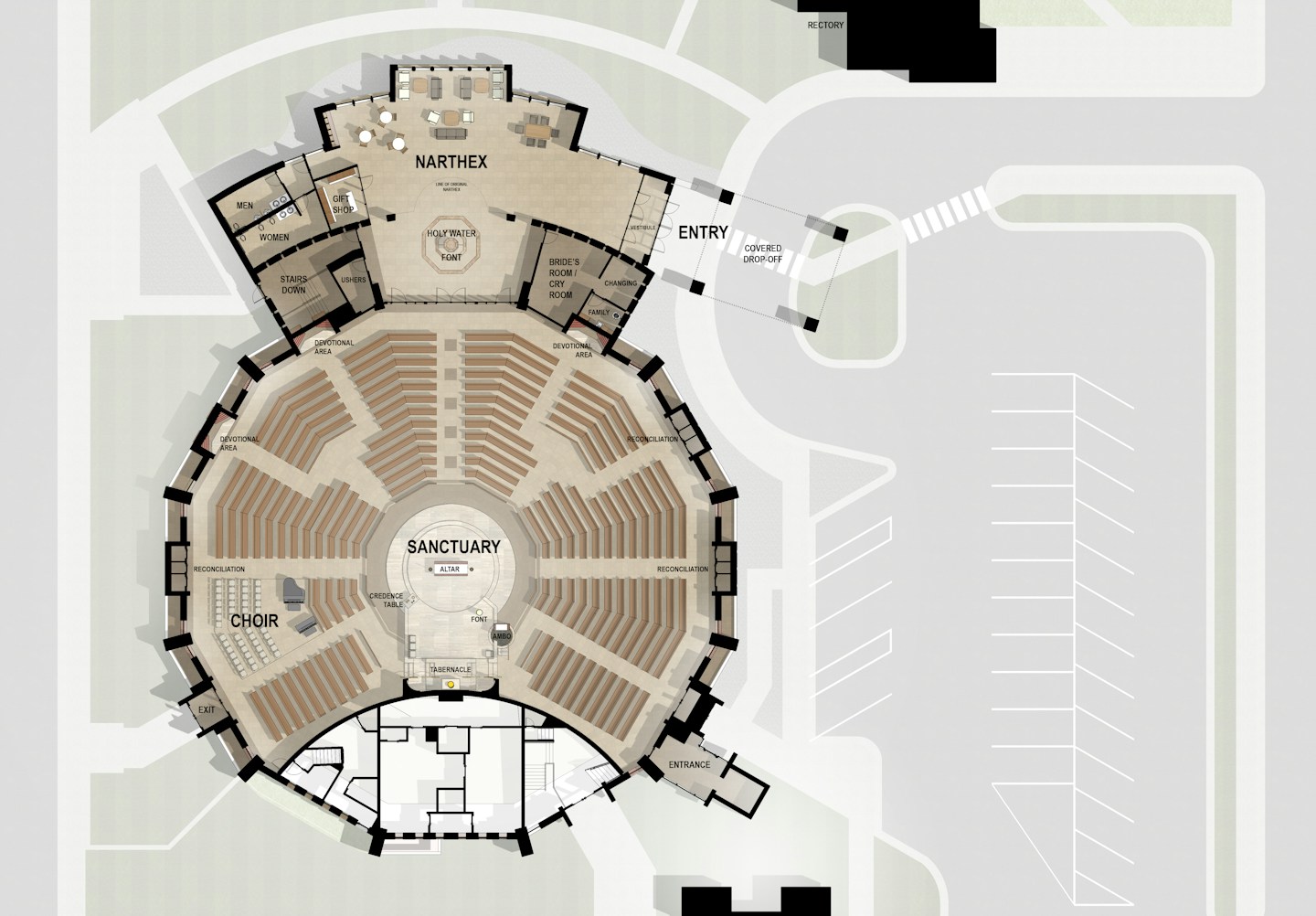 SFS provided design services for the renovation and expansion of St. Joseph Catholic Church and its parish ministry center. The project began with a feasibility study to explore options. Following evaluation of existing facilities, programming meetings were held with key stakeholders to confirm space needs for elements of the church, including liturgy, baptistry, liturgical art, music, narthex, bride’s room and gift shop. Concept design options with cost implications were generated for the worship space renovation, gathering space addition and parish center improvements. Renderings and other graphics were developed to support the Church’s capital campaign, which was successful.