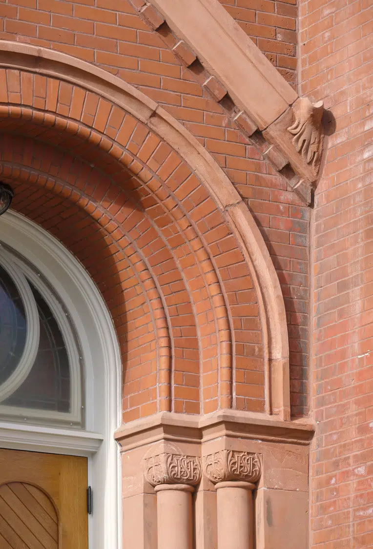 Exterior restoration included tuck pointing, stone repair and consolidation, exterior painting, sheet metal replacement, flashing and sealant, new handrails, retaining wall replacement, and repair of stairs and exterior doors. A covered entryway to the basement-level social hall was also provided.
