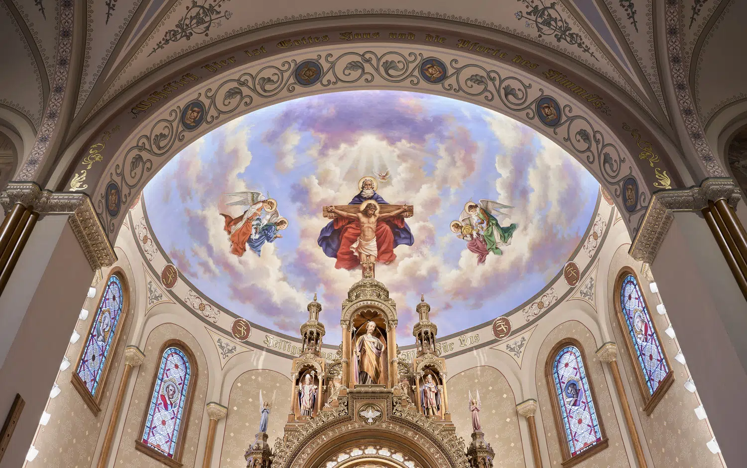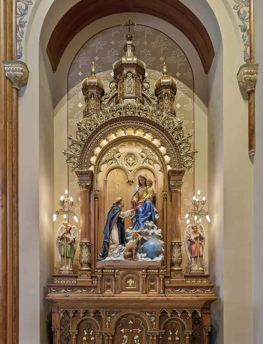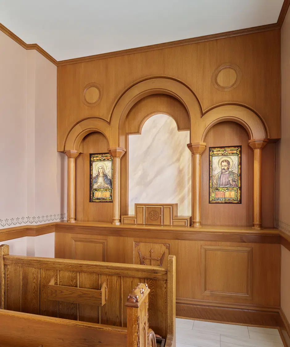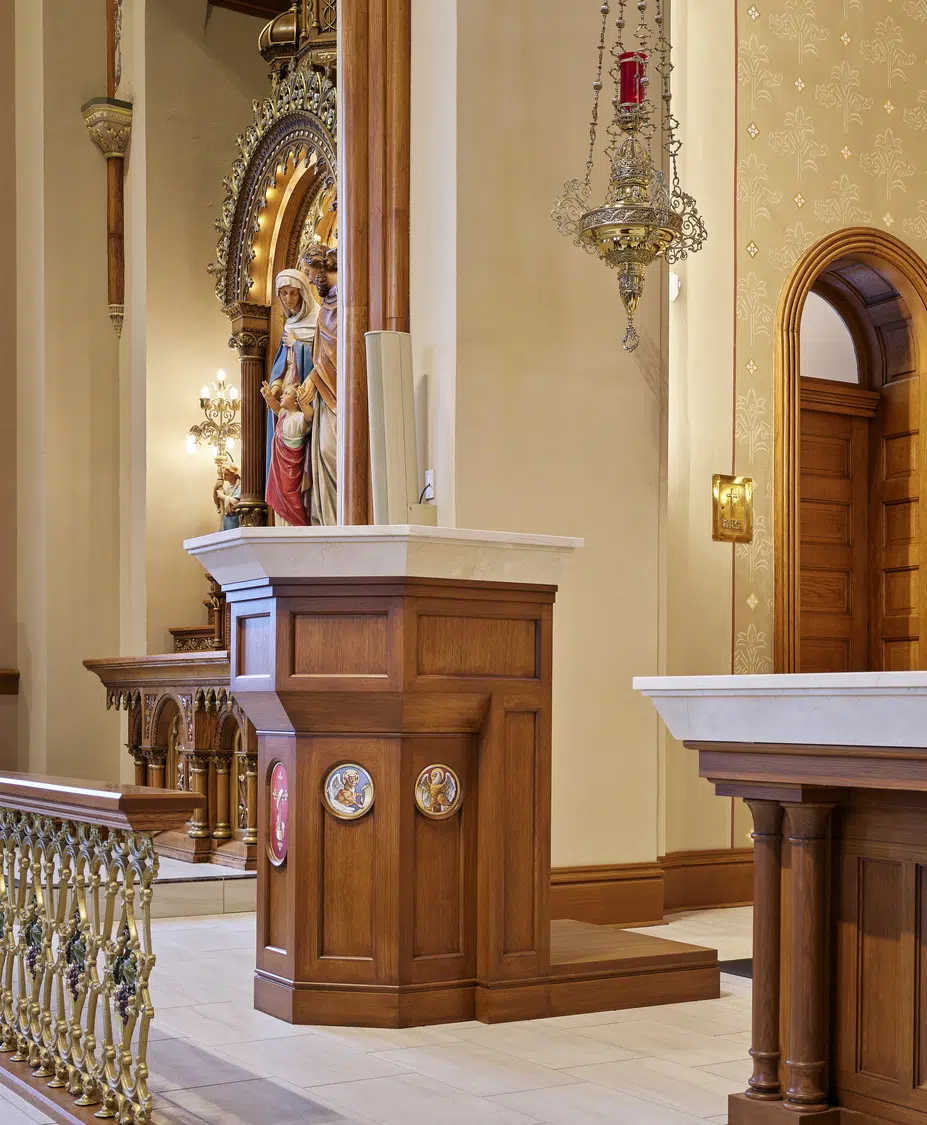 Interior restoration included all spaces on the main floor and choir loft, new finishes, plaster repair, decorative and general painting, restoration of natural wood finish throughout, replacement of wall between narthex and Nave, elevator replacement, all new conduit, general and specialty lighting, HVAC upgrades, new handrails, renovation of the Adoration Chapel and Sacristy, communion railing, confessionals and original altars, and a new altar and ambo. SFS also managed decorative painting, restoration of stained glass, original organ and enclosure, statuary, Stations of the Cross, and original murals.