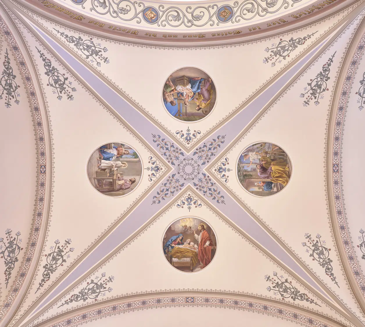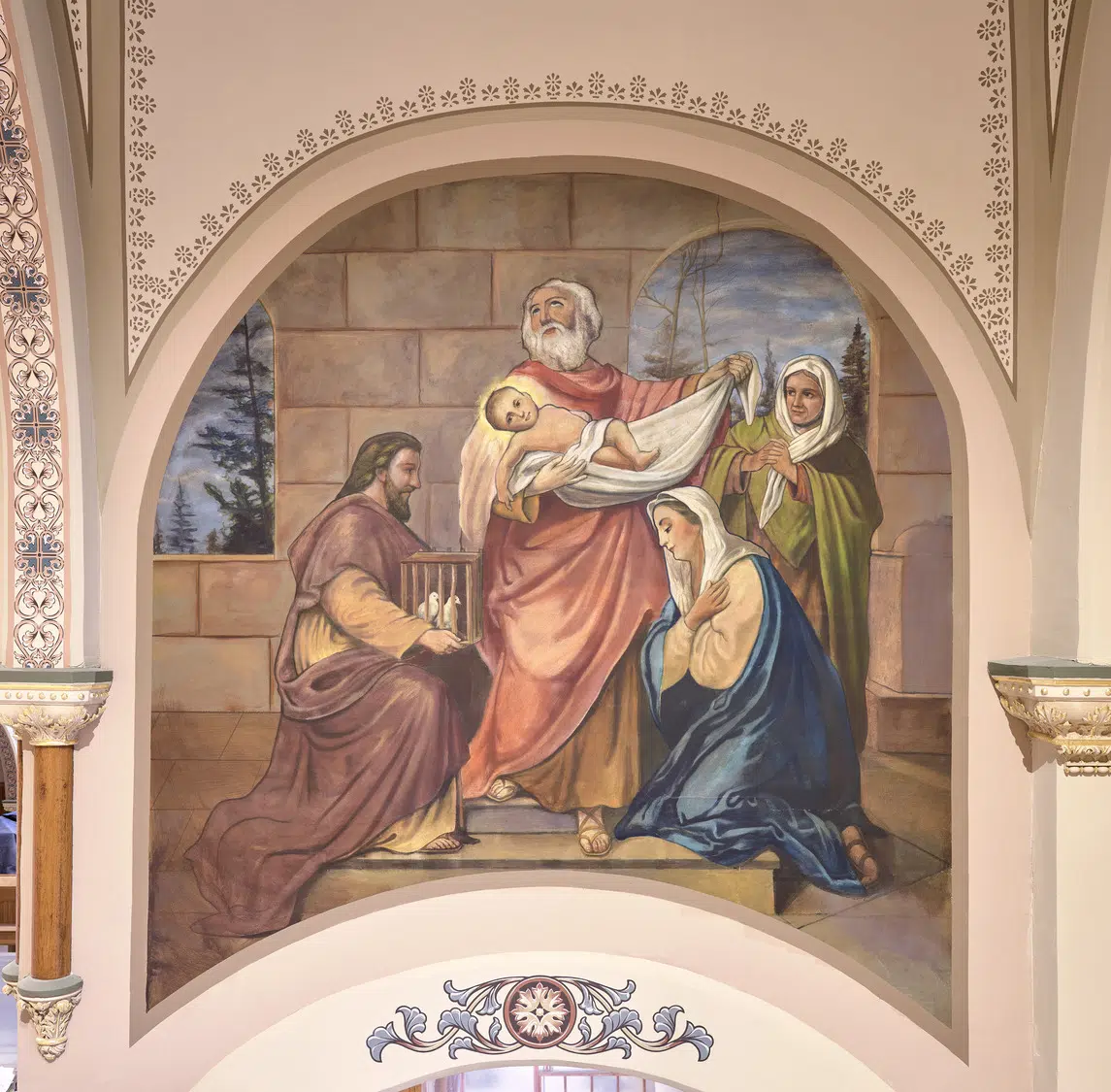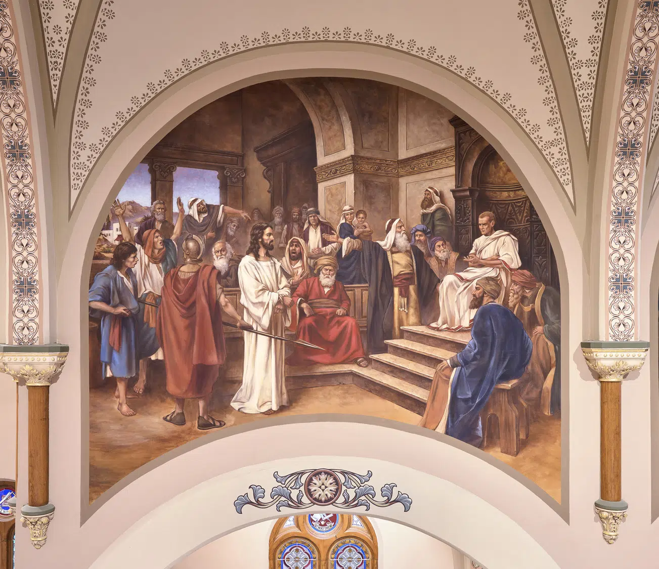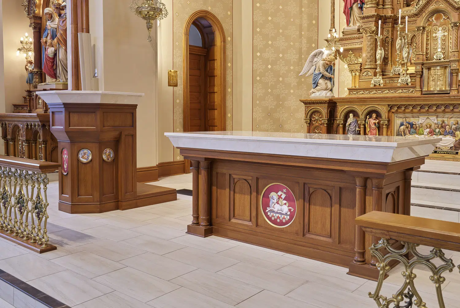 Interior restoration included all spaces on the main floor and choir loft, new finishes, plaster repair, decorative and general painting, restoration of natural wood finish throughout, replacement of wall between narthex and Nave, elevator replacement, all new conduit, general and specialty lighting, HVAC upgrades, new handrails, renovation of the Adoration Chapel and Sacristy, communion railing, confessionals and original altars, and a new altar and ambo. SFS also managed decorative painting, restoration of stained glass, original organ and enclosure, statuary, Stations of the Cross, and original murals.
