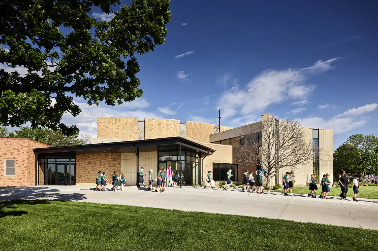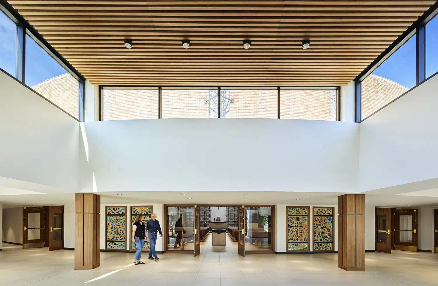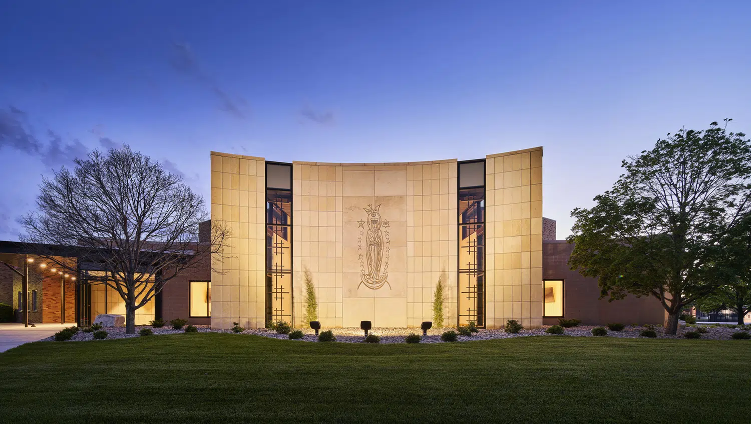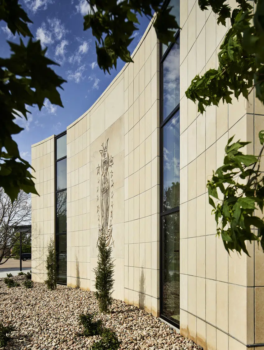 A portion of the new narthex was raised above the existing low secondary volume with a concave curving facade, countering the convex curvature of the existing church and providing a home for the hand-carved bas relief Mary Queen of the Universe from original construction.
