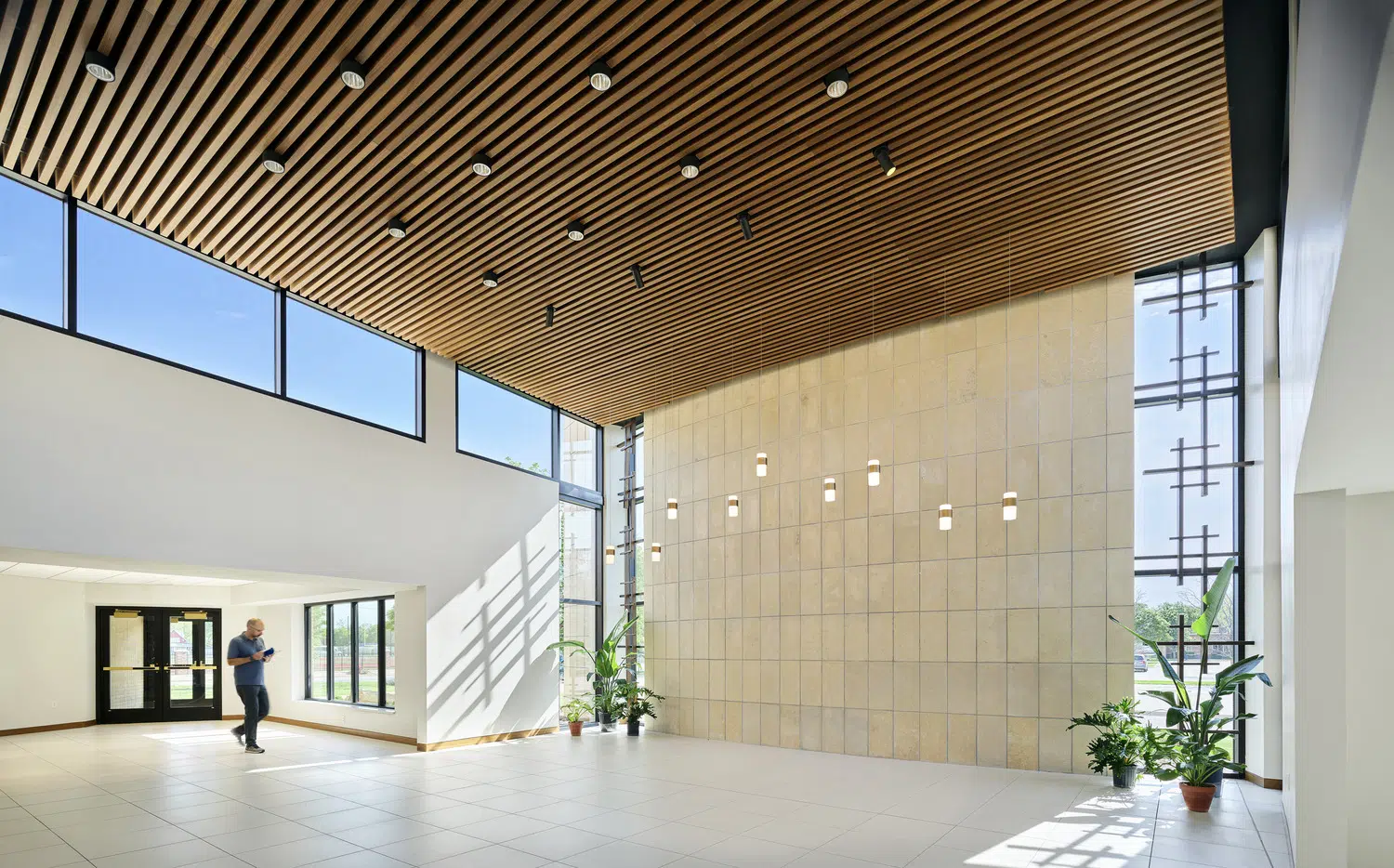 Crafting a dialog between the structure’s existing language and its new enhancements, a large narthex replaced the building’s original entry. Nearly three times larger than the previous gathering area, it features a cry room, bride’s room, restrooms, usher’s (ministry) room and sacristy. Daylight fills the vestibule via clerestory windows. The curve of the exterior wall is clad in native Kansas limestone, and original cross patterns are incorporated sparingly.