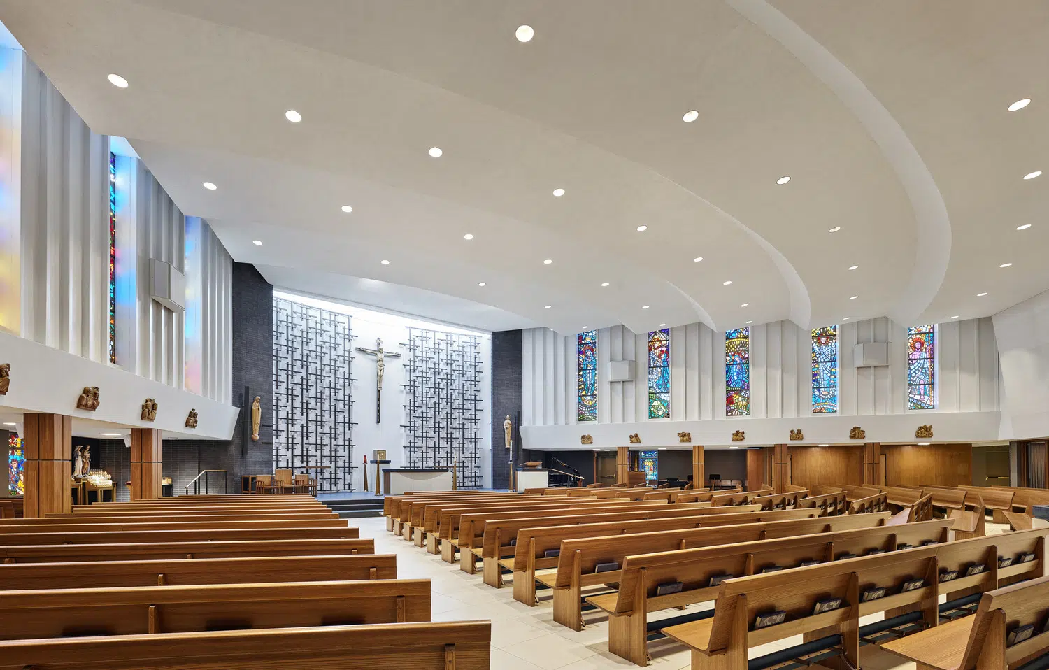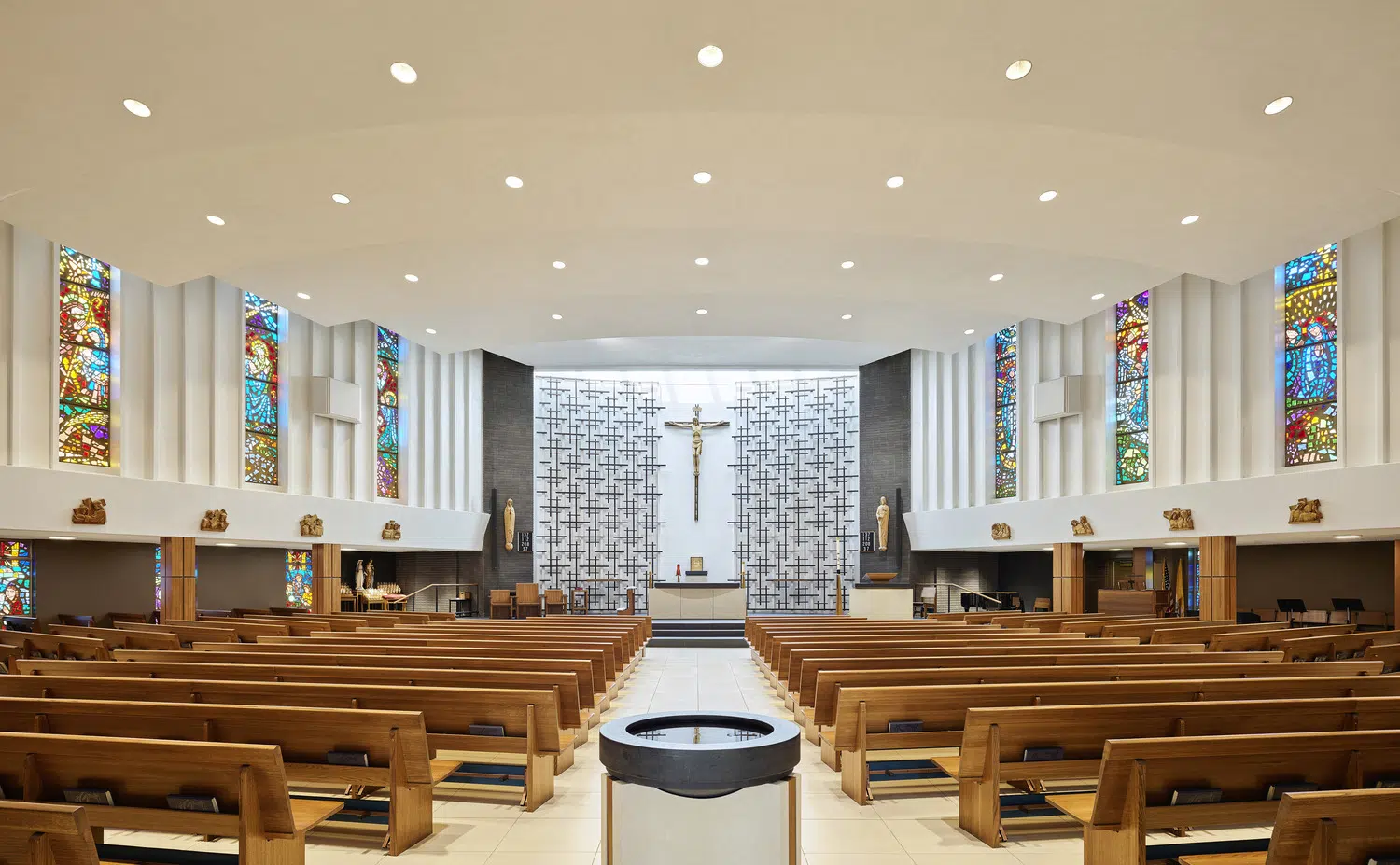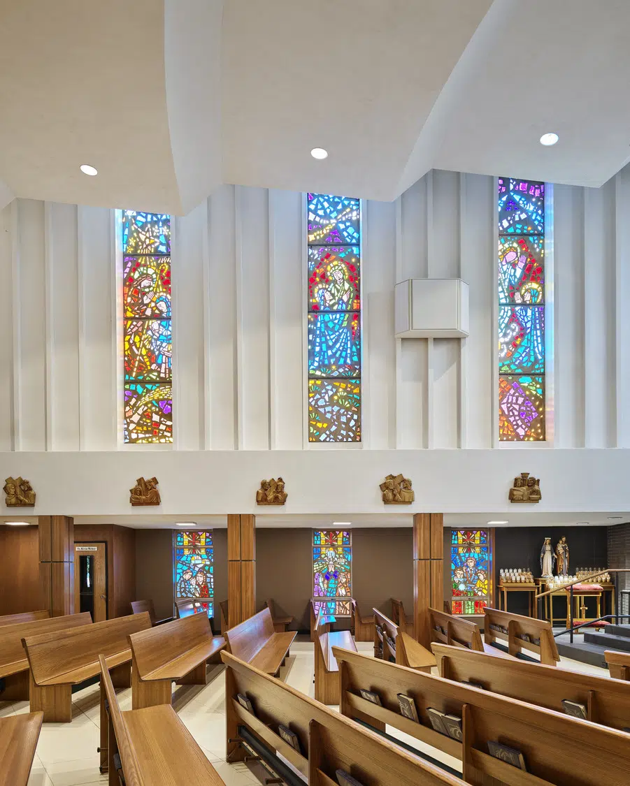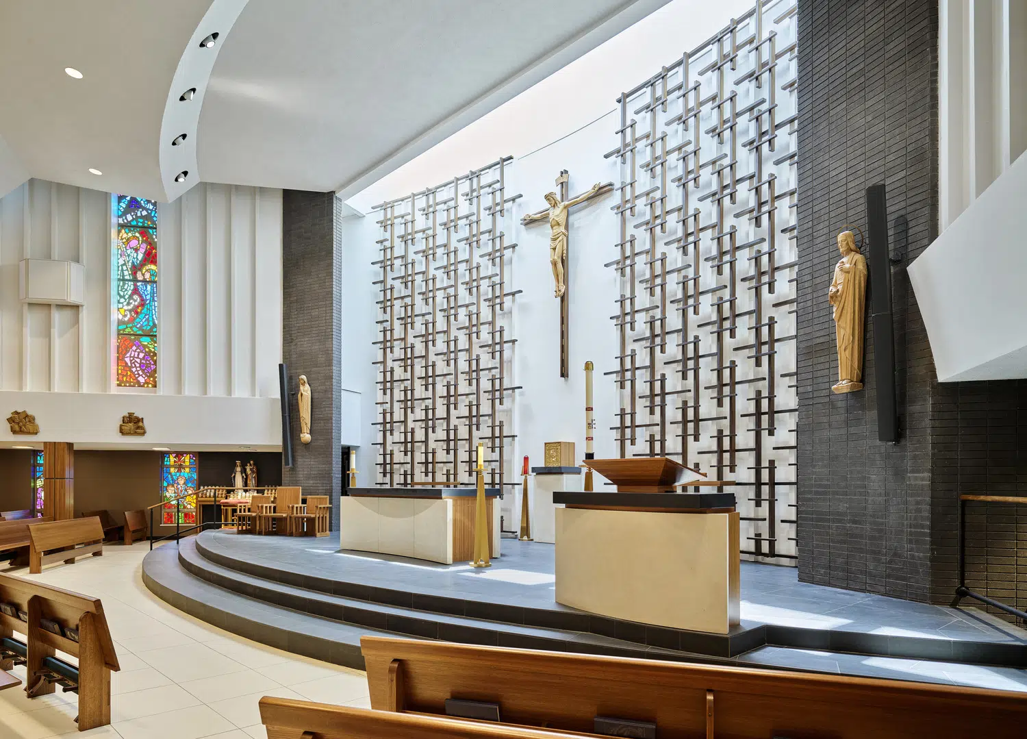 Following a successful capital campaign, the sanctuary was redesigned to provide a single level for the altar, ambo and priest chair, and a section of the north wall was moved outward to provide space for the choir. The existing cross pattern was refined by selectively reinstalling them against a white wall. Above them, a new wall-to-wall skylight allows daylight to permeate the sanctuary.