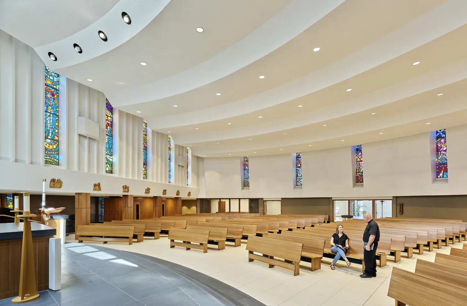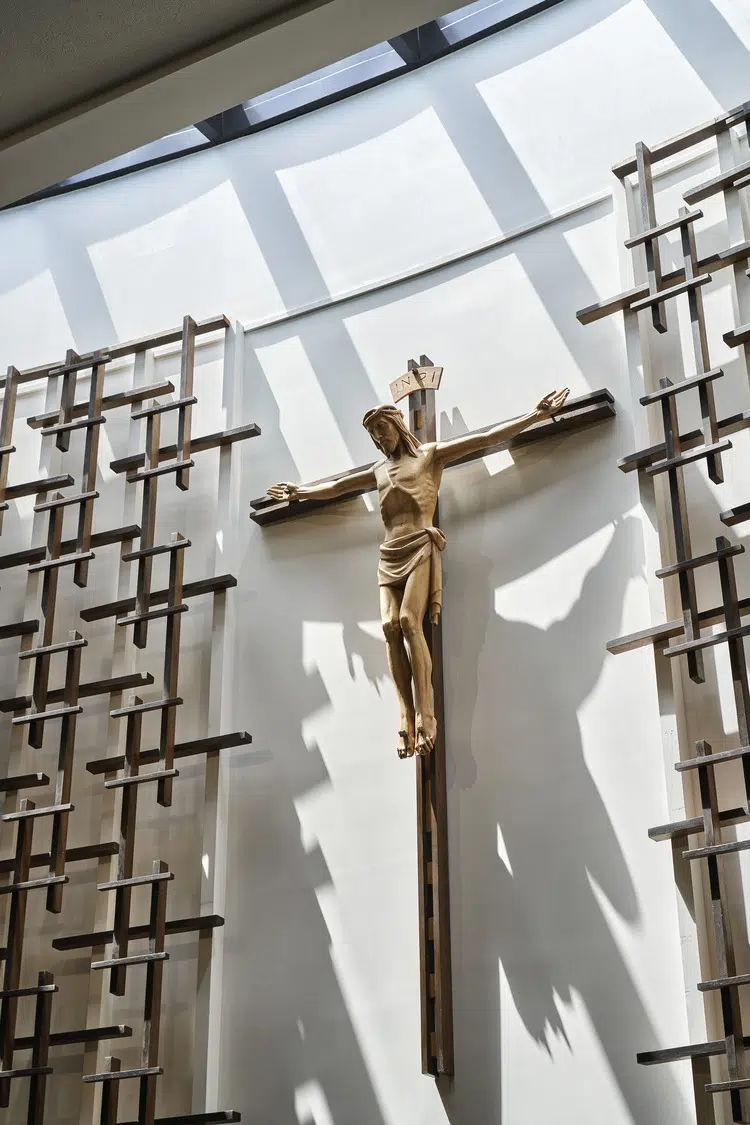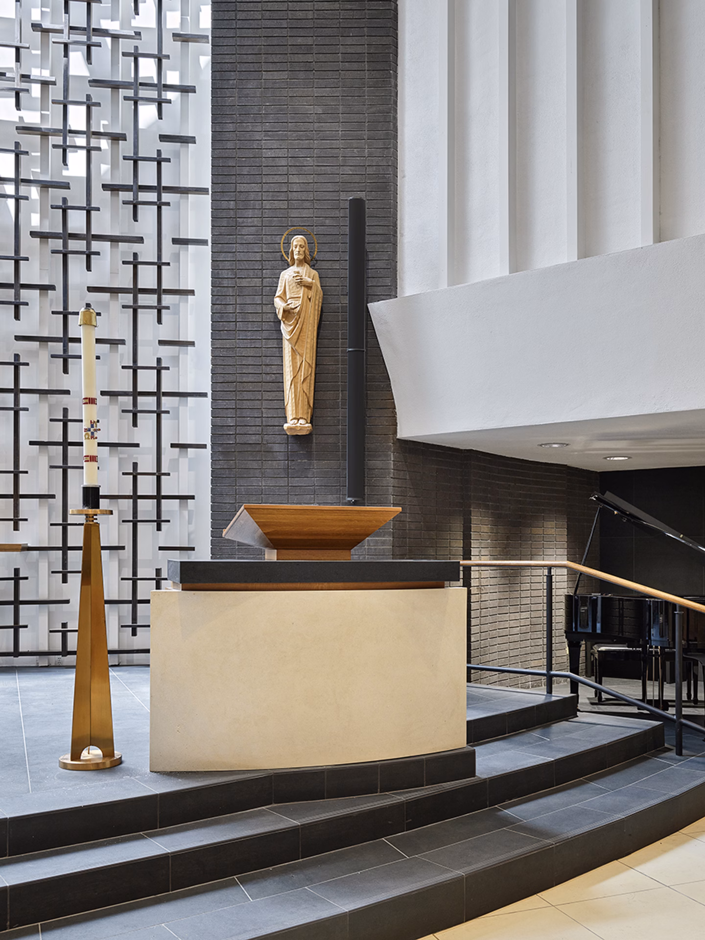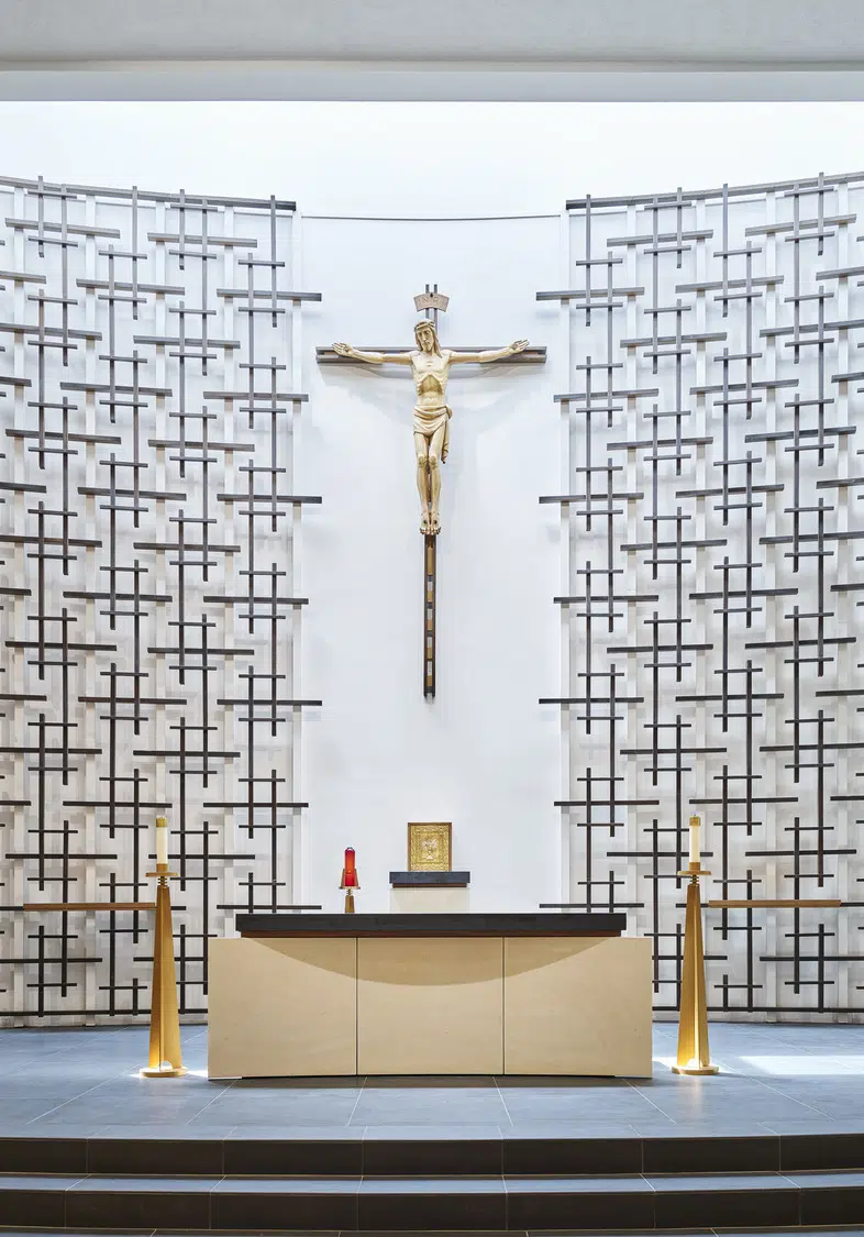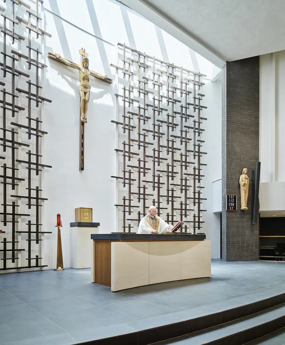 Following a successful capital campaign, the sanctuary was redesigned to provide a single level for the altar, ambo and priest chair, and a section of the north wall was moved outward to provide space for the choir. The existing cross pattern was refined by selectively reinstalling them against a white wall. Above them, a new wall-to-wall skylight allows daylight to permeate the sanctuary.