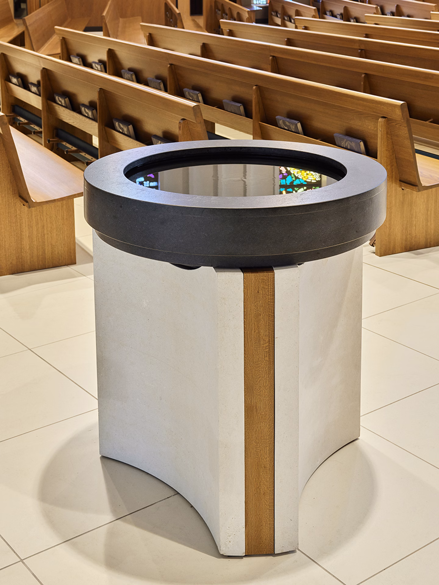 A new altar, ambo and baptismal font were designed using limestone and granite with accents of recycled wood from the existing pews.