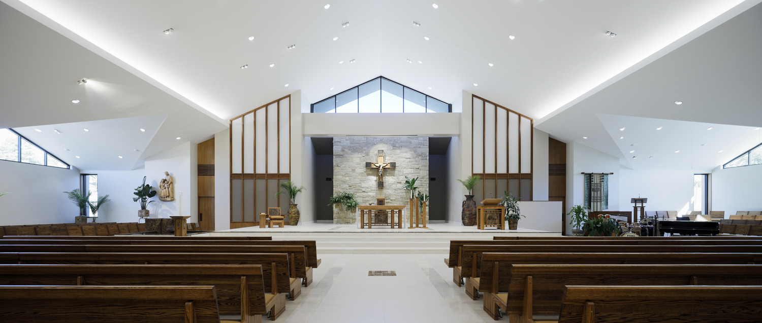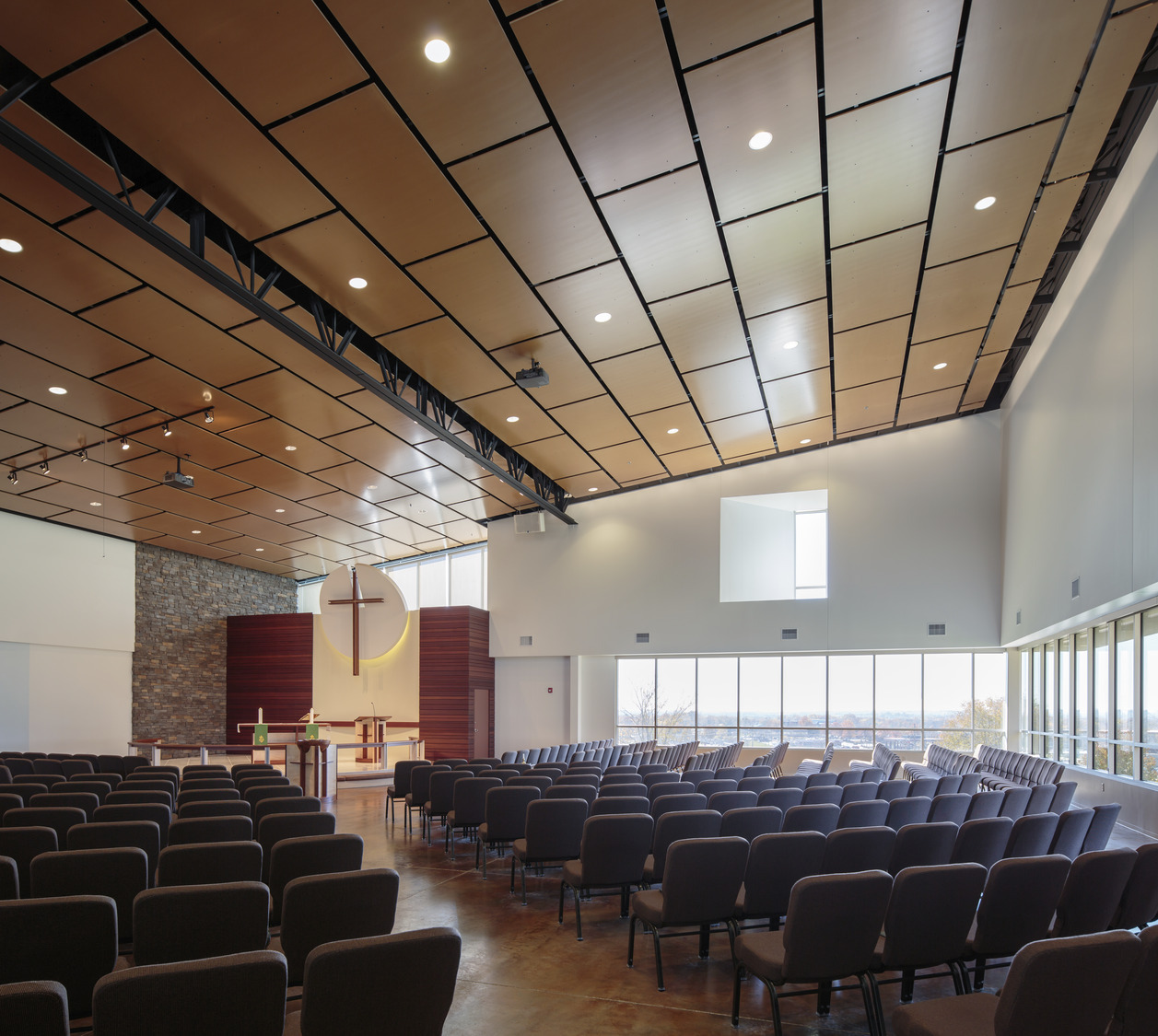 A new worship space was created to meet both current and future space requirements. Rather than overbuild the worship space at this time, classrooms were located in space that would eventually convert to worship when the capacity is needed. The new worship space takes advantage of the site’s hilltop views with expansive windows for natural light and a vertical tower element visible for miles. The natural light, which bathes the worship space, creates an environment that is continually in animation through the changing position of the sun.